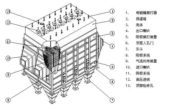 水泥厂布袋除尘器工艺图,主要由箱体、袋室、灰斗、进出风口、支柱、爬梯、栏杆、喷吹系统、清灰控制器等部分组成。